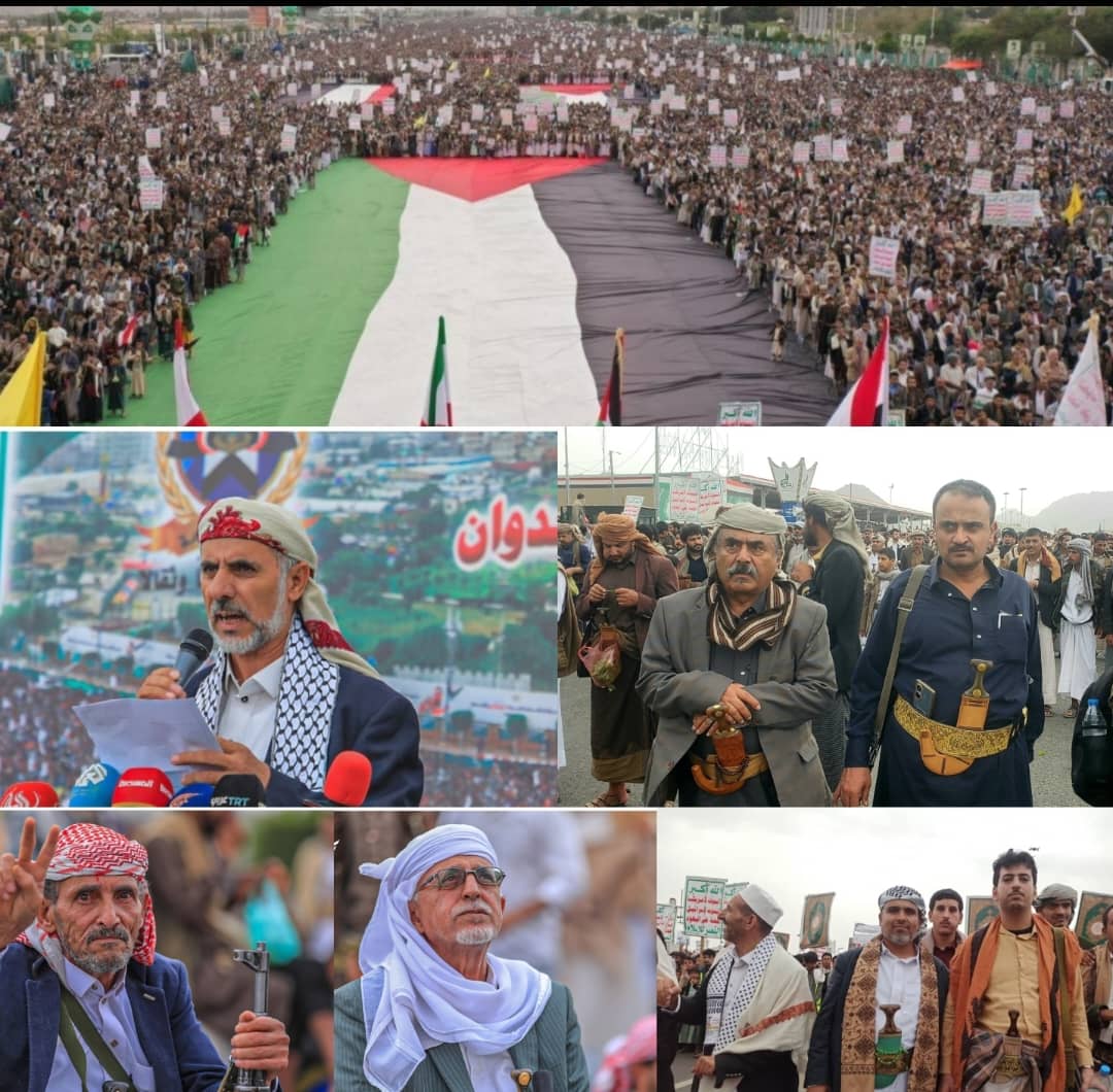 وصرخت الحشود (ثوروا يا شرفاء العالم، غزة مأساة تتفاقم)، (إن حشدوا زدنا إصرار، بجهوزية.. واستنفار)، (في غزة لله رجال، معجزة في الاستبسال)، (يا غزة يا جند الله، معكم حتى نلقى الله)، (الجهاد الجهاد، كل الشعب على استعداد)، (يا غزة يا فلسطين، معكم كل اليمنيين)، (فوضناك يا قائدنا فوضناك).
