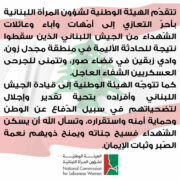 تتقدّم الهيئة الوطنية لشؤون المرأة اللبنانية بأحرّ التعازي إلى أمّهات وآباء وعائلات الشّهداء من الجيش اللبناني الذين سقطوا نتيجة للحادثة الأليمة في منطقة مجدل زون، وادي زبقين في قضاء صور،… Read more »